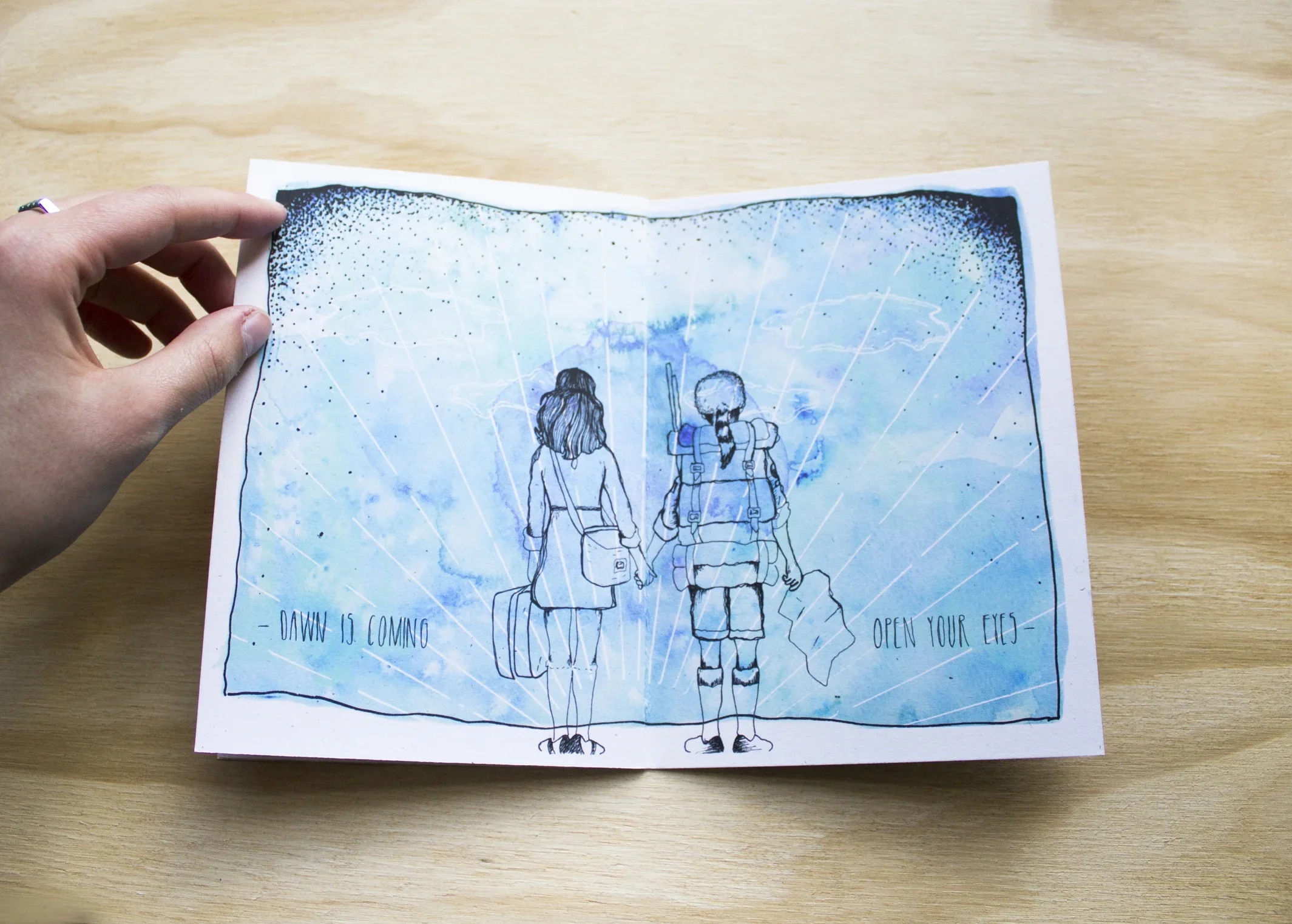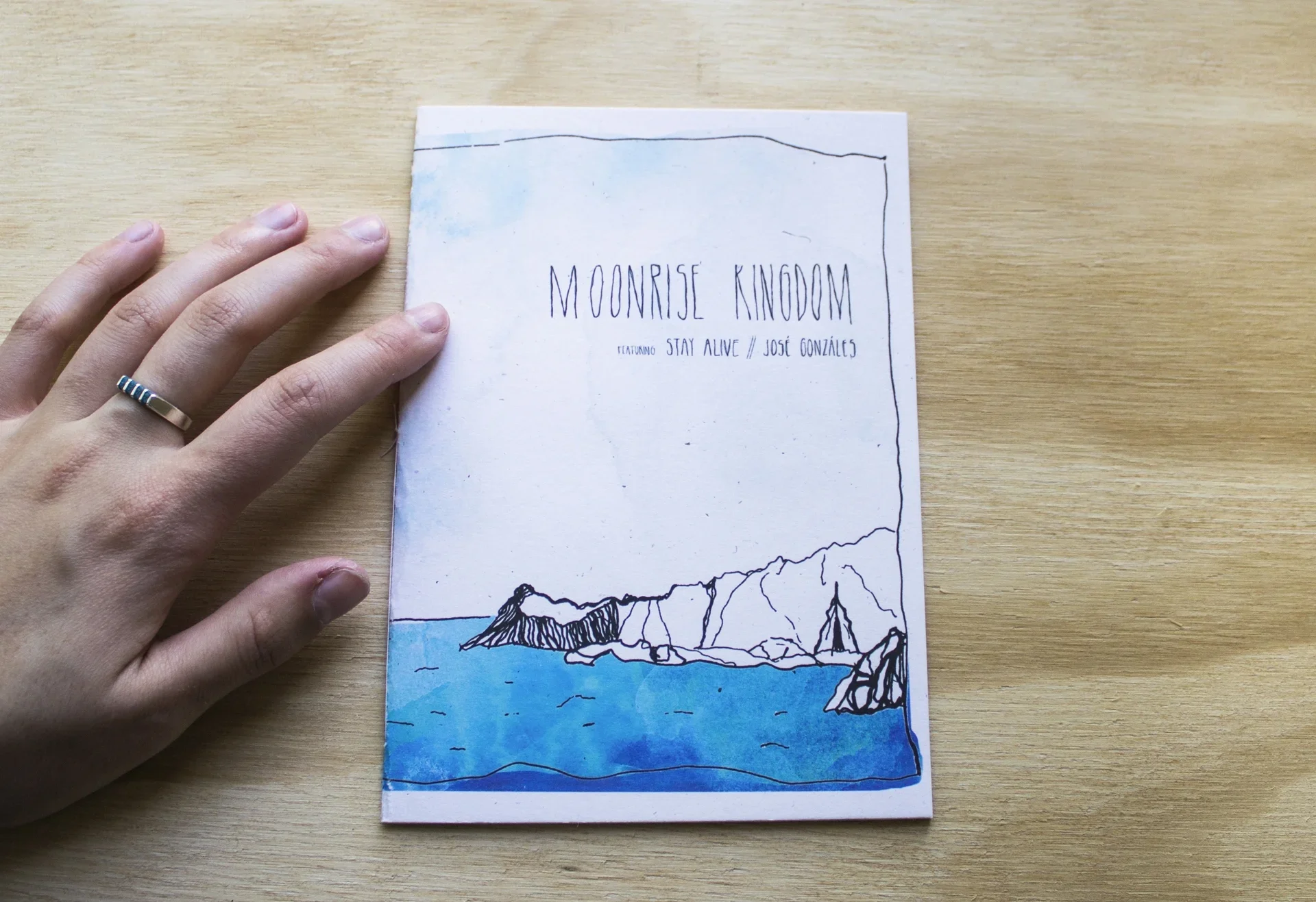An illustrated, handbound, zine combining scenes from the Wes Anderson film, Moonrise Kingdom, and lyrics from Stay Alive by Jose Gonzalez to emphasize themes of adventure and friendship. Illustrations and hand-done typography are inspired by adolescence and elements of nature.